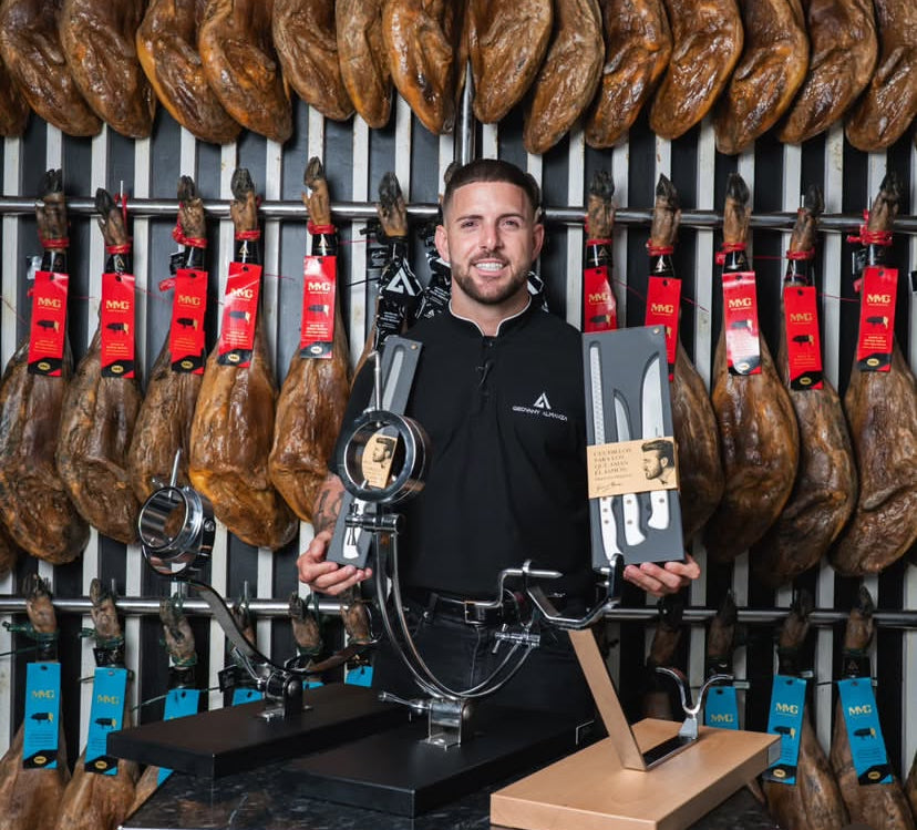 Geovany Almanza, campeón de España y del mundo de corte de jamón, confía en Jamoneros Abellán por su máxima precisión, estabilidad y calidad. Junto a él hemos diseñado un jamonero de la gama más alta, creado para responder a las exigencias del corte profesional al más alto nivel.