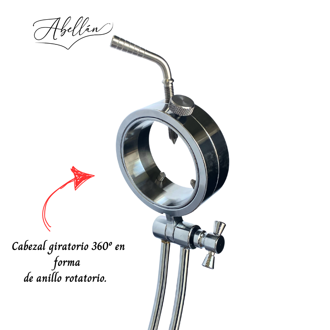 Su estructura combina robustez, elegancia y tecnología funcional, permitiendo un manejo perfecto de la pieza de jamón en cualquier ángulo. Gracias a su doble sistema de movimiento —cabezal giratorio 360° y cabezal basculante— y al soporte “V” móvil sin pinchos, garantiza cortes finos, estables y seguros incluso en piezas grandes y grasas como jamones de bellota o duroc.