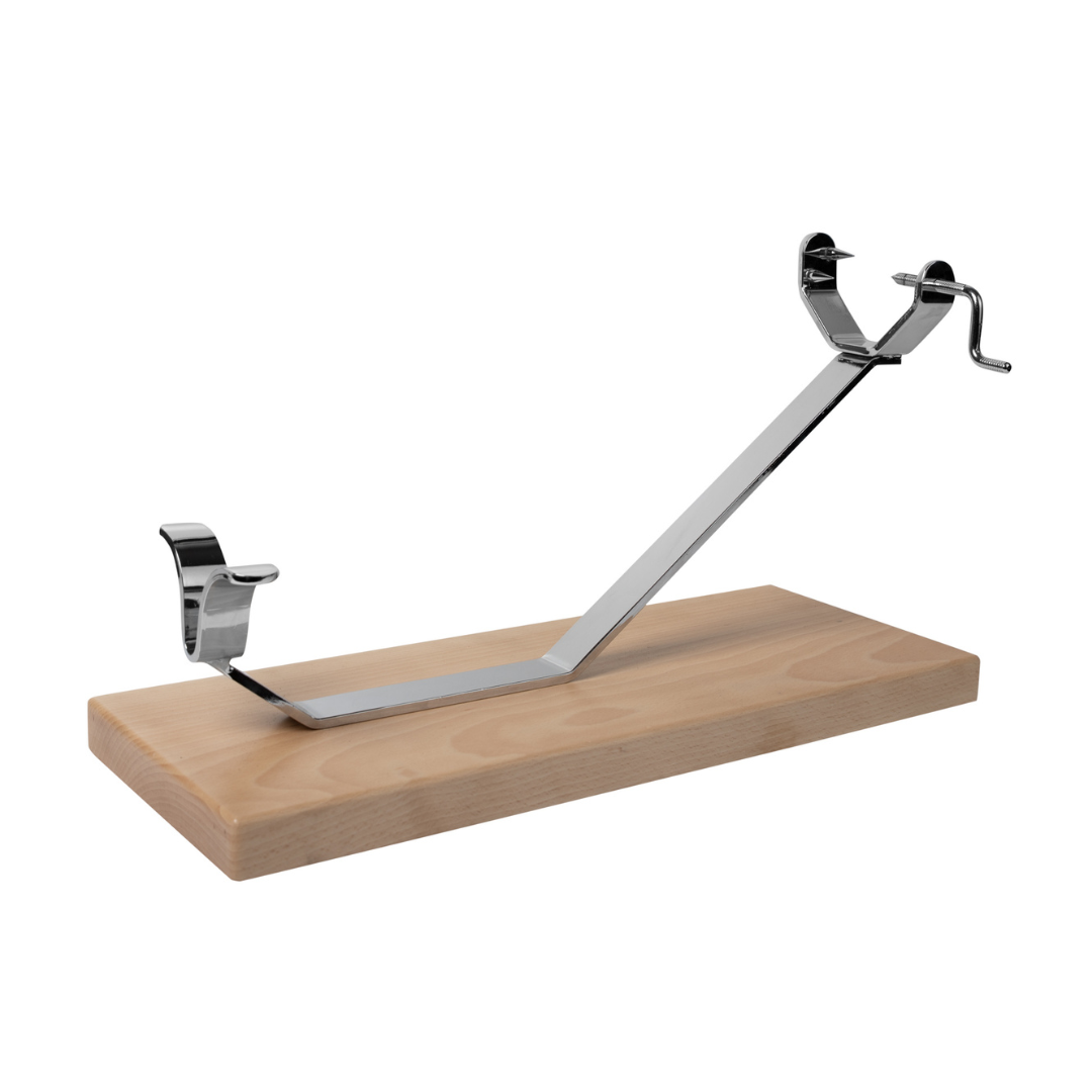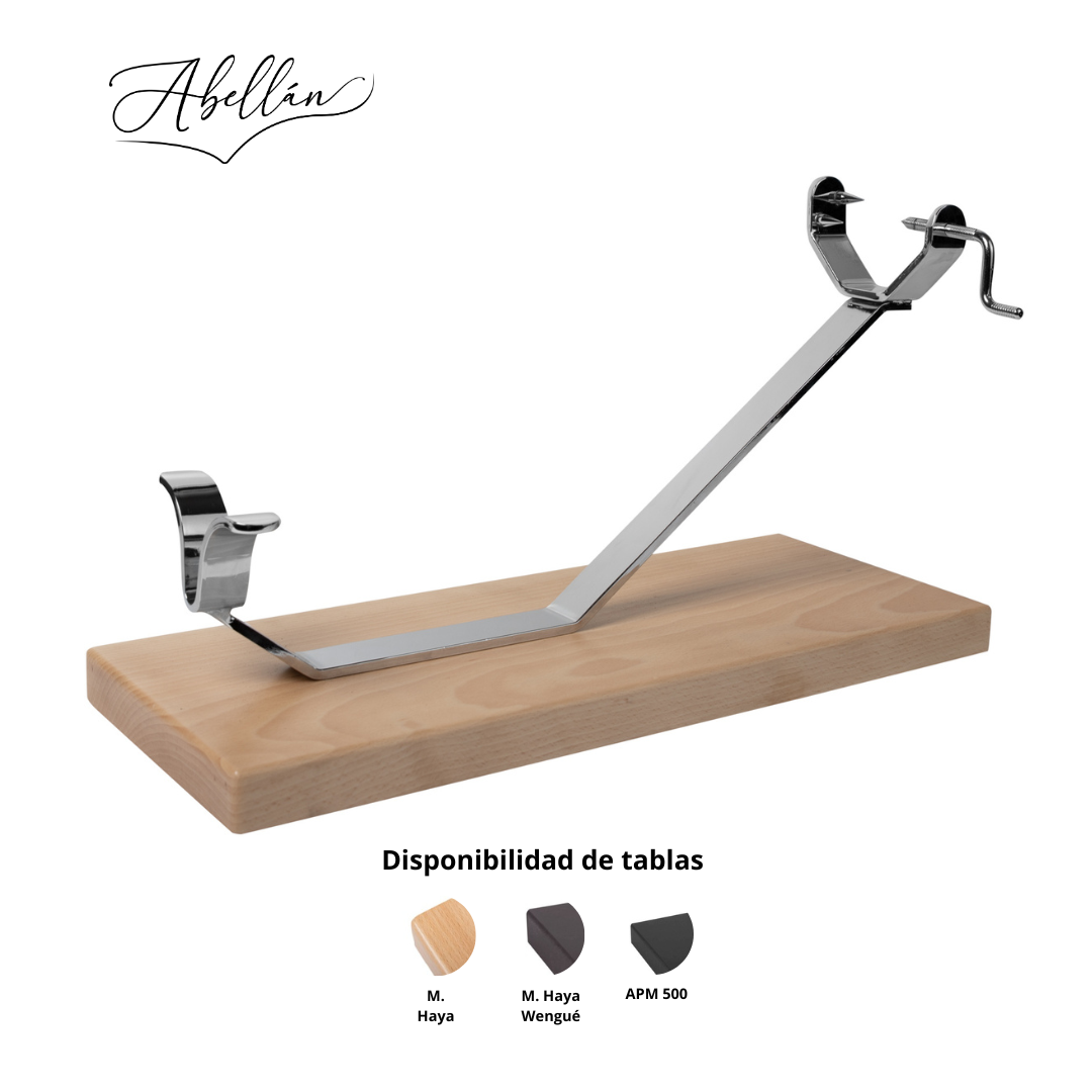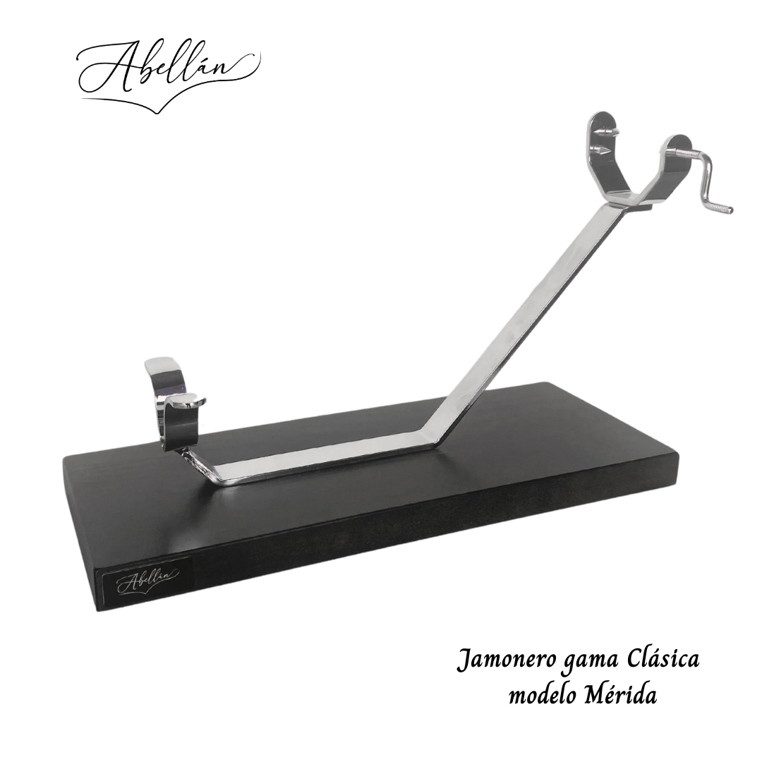 El jamonero Mérida Clásico de Jamoneros Abellán ha sido diseñado para quienes valoran la simplicidad funcional y la estabilidad en el corte de jamón. Con una base fija de madera y herrajes cromados, ofrece una plataforma sólida y confiable, ideal para el uso diario tanto en casa como en restaurantes tradicionales.